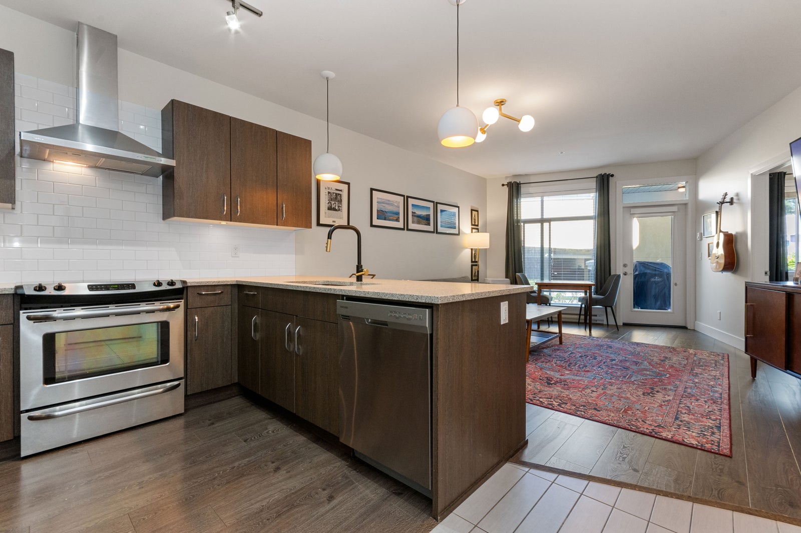 Radius is the building at the heart of the dynamic, scenic and walkable neighborhood we know and love called Garrison Crossing. #216 has a great location in the building, is the home with the fantastic floorplan, a condo that is wider than most with a larger covered sundeck with very pleasant views, it just feels right. Such a modern and warm home, 9 ft ceilings, quality finishings, fresh carpets and paint, all new lighting, shows so well. Kitchen with stainless steel appliances perfectly matches the soft close cabinets, inlay sink, quartz countertops open to the living room. Two underground parking spots, storage locker, one cat or dog without size restrictions. Truly an executive space, you’ll love this condo, view today.