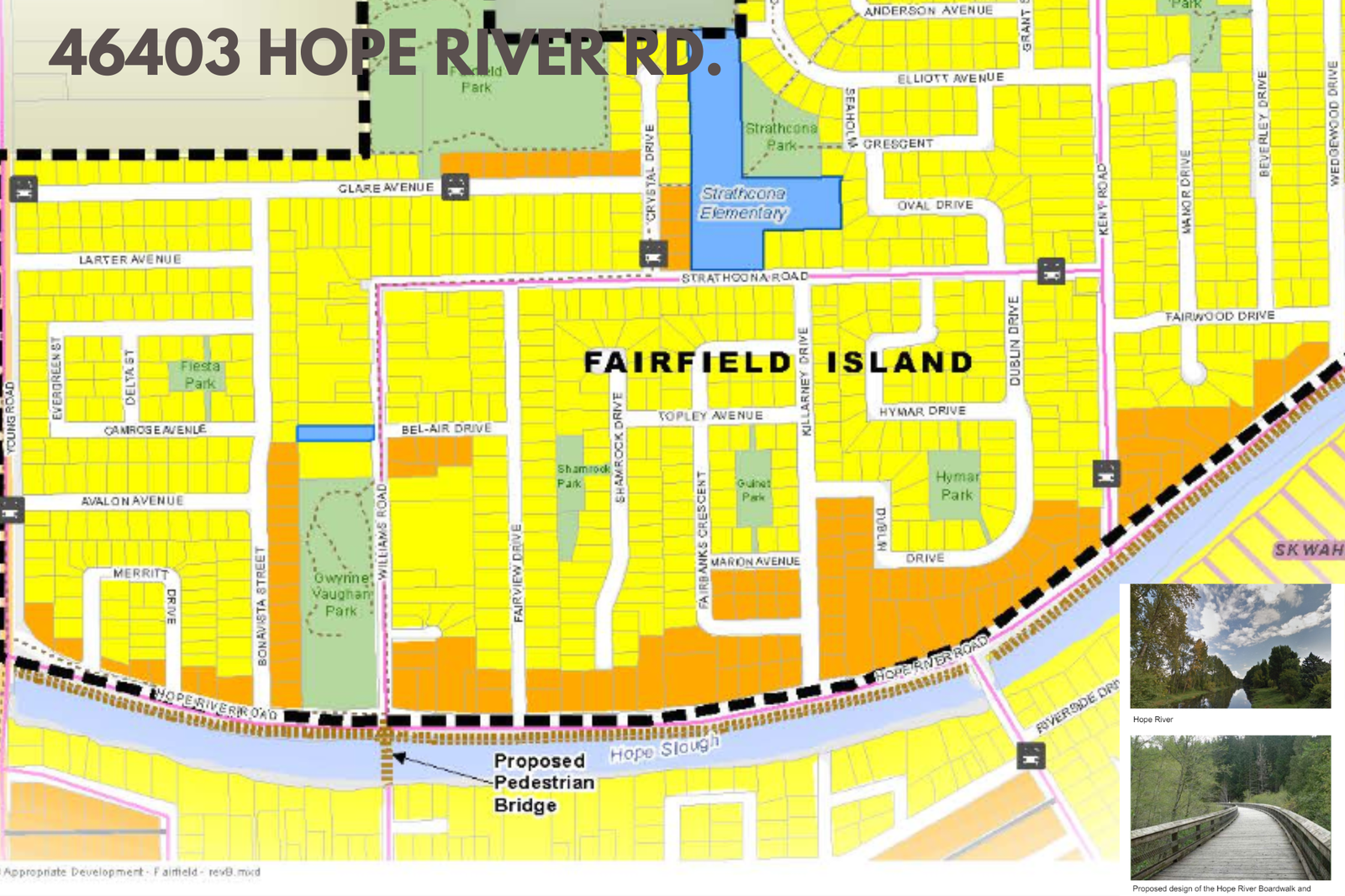 The OCP has plans for this area, perhaps more walkable area along the scenic Hope River and a Pedestrian Bridge for a faster walkable connect to downtown Chilliwack and District 1881.