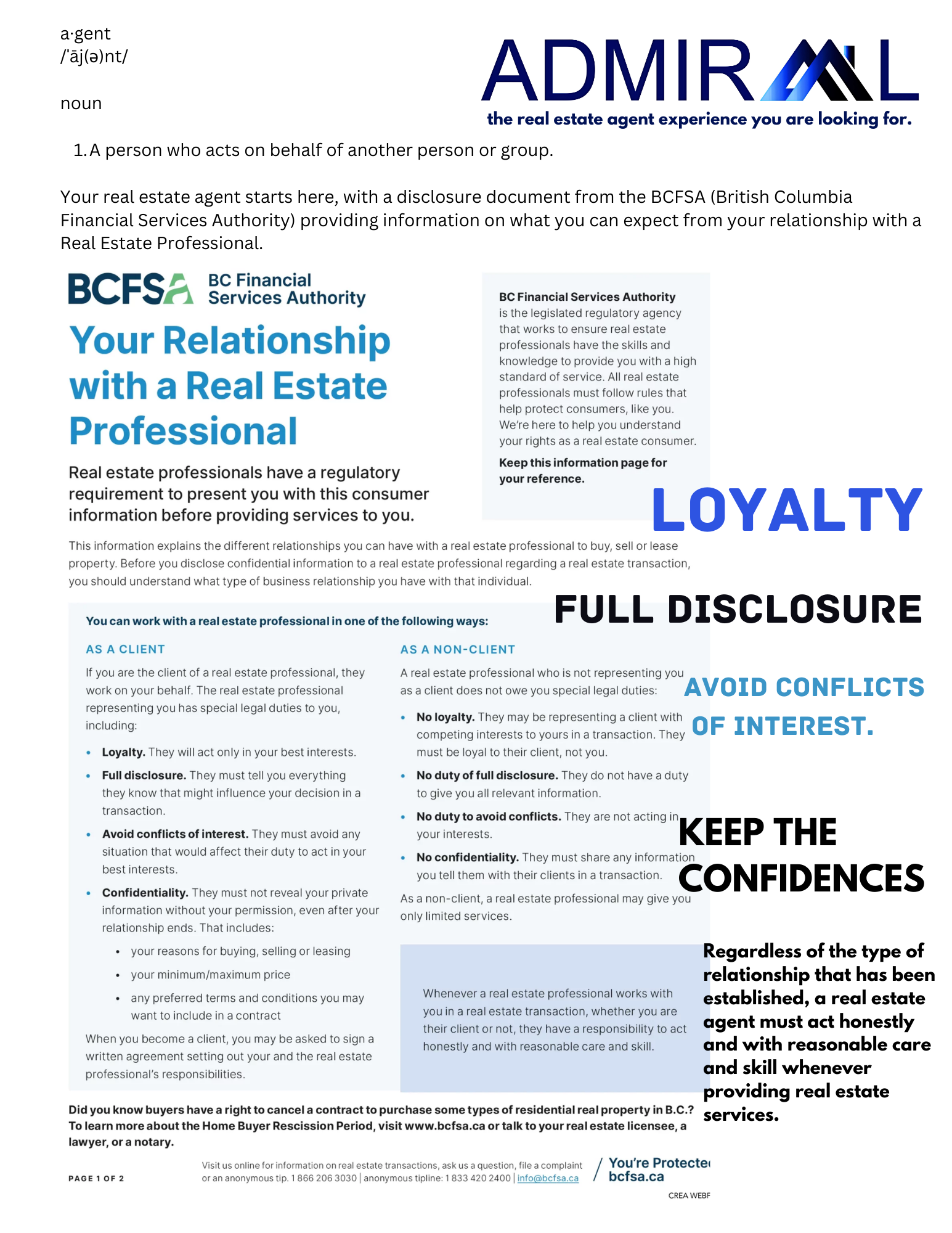 Regardless of the type of relationship that has been established, a real estate agent must act honestly and with reasonable care and skill wheneverproviding real estate services.