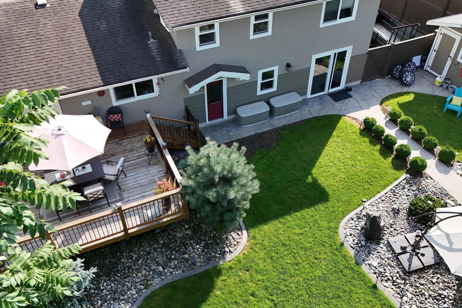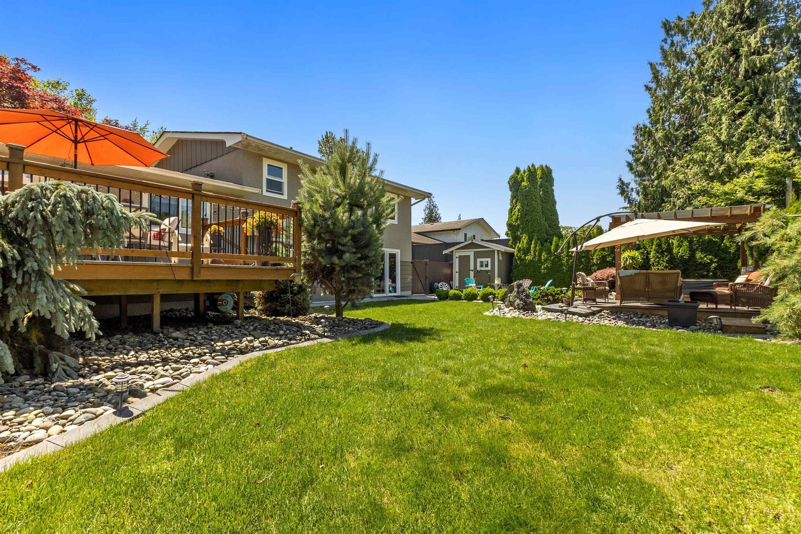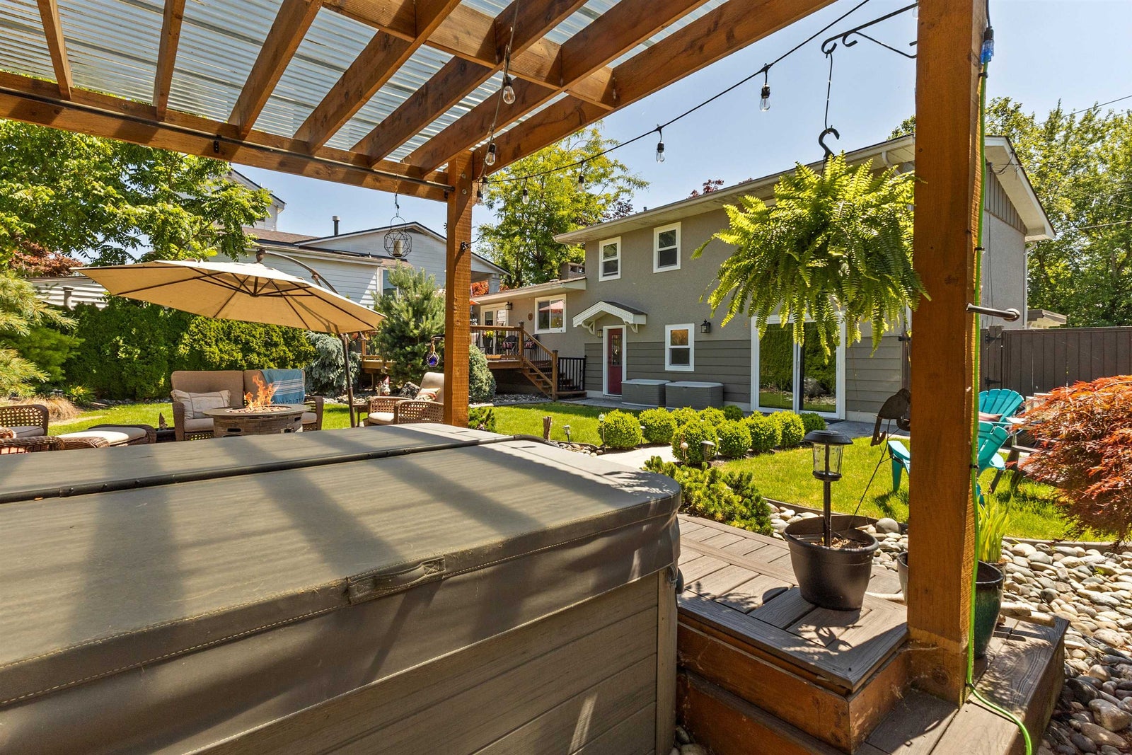 Classy beautiful home, fully updated, valuable property with views of Hope River. Fantastic living spaces on all 3 levels incl. formal level entry and family room with easy walkout to the amazing yard space. Main floor with living rm with a new natural gas fireplace and south-facing windows w/ motorized blinds. Modern kitchen with shaker cabinets, quartz counters, inlay sink, gas range and island open to the dining rm w/ French doors to the sundeck. Upper level with 3 good-sized bedrms, primary w/ ensuite, deluxe 5-pce main bathrm. Quality updates throughout. Excellent in the city location, 80 ft frontage, 8,712 sq ft landscaped property, in-ground sprinklers, large newer concrete driveway, RV parking, private backyard with patio, sundeck and gazebo with hot tub. Location and style!
